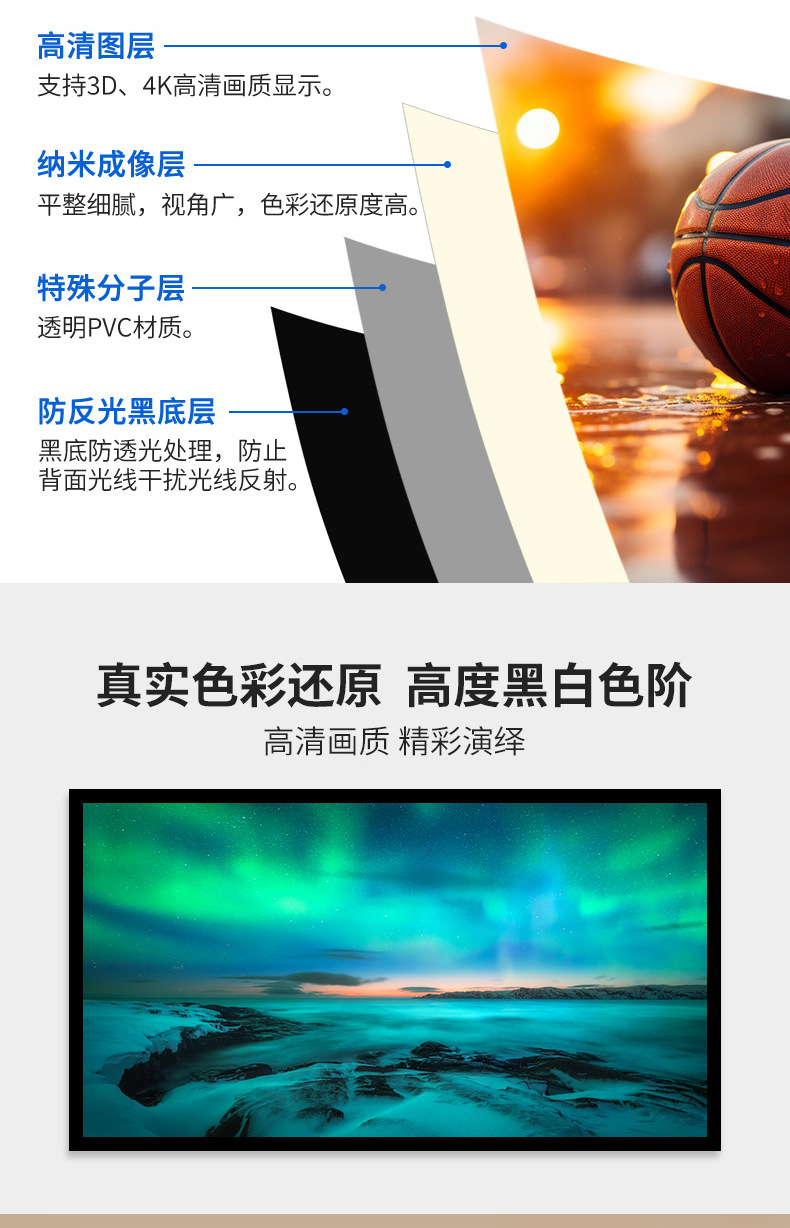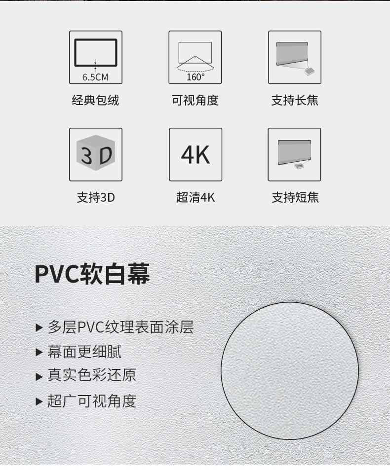 可选幕料:PVC软白幕,PVC软灰幕,高对比度金属软幕,珍珠白幕,音速4K编织透声幕。