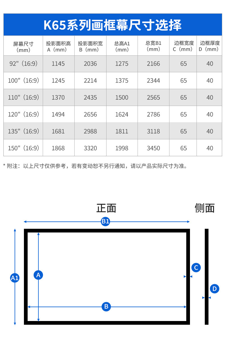 | K92H65 | 92 | 16:9 | 1145 | 2036 | 1275 | 2166 | PVC软白幕 | 1.1 | 65 | 40 |