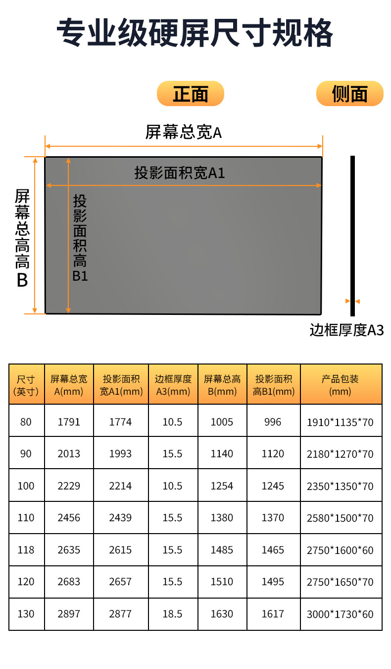 | 长焦菲涅尔抗光硬屏(专业级) | HBP80H1-FL2 | 80 | 16:9 | 1774*996 | 1791*1005*10.5 | 1910*1135*70 | 碳钢 蜂窝板 | 8mm | 22.5 | 14 | 增益:≥2.0 抗光性:≥90% | 1. 适合800~3000lm机器 2. 不建议匹配三色激光投影 3. 圆弧款金属边框,进口牛皮纸包装 |