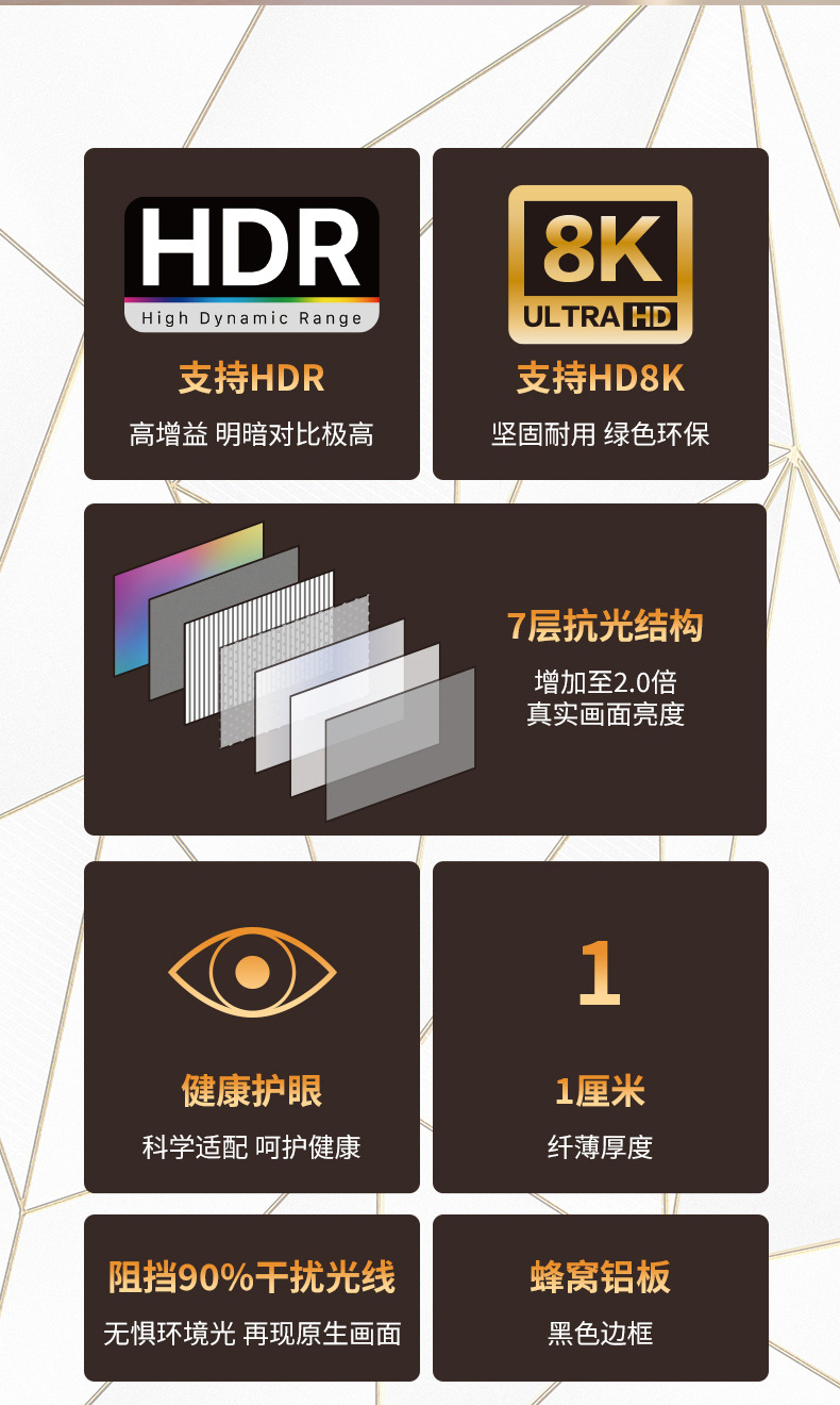 | 超短焦三色菲涅尔抗光硬屏(专业级) | HBP80H1-FST16 | 80 | 16:9 | 1774*996 | 1791*1005*15.5 | 1910*1135*70 | 22.5 | 14 | 增益:≥1.6 抗光性:≥90% 天花反光:不反光 | 1. 可以支持三色激光电视(如坚果/海信等) 2. 兼容单色激光,卖点:视角大,无天花反光 3. 圆弧款金属边框,进口牛皮纸包装 |
